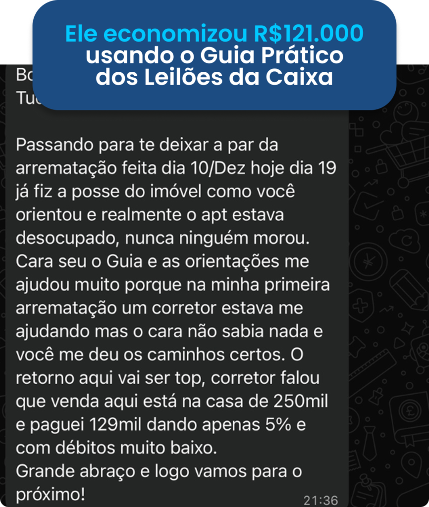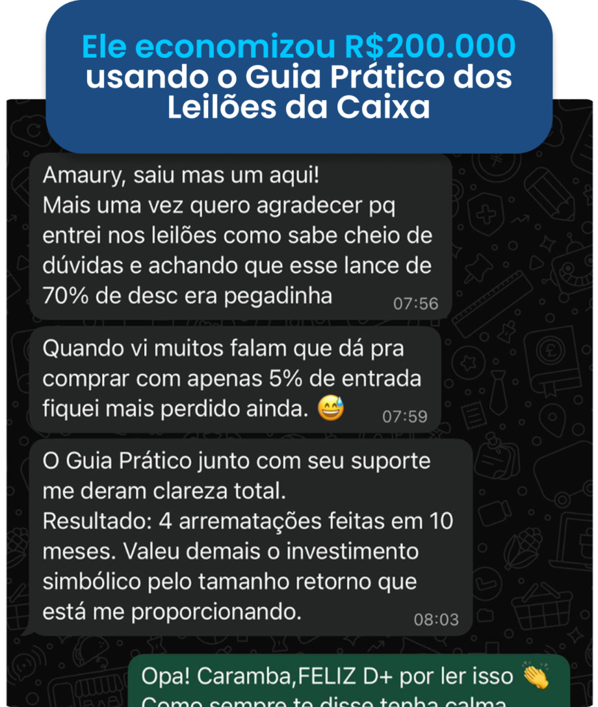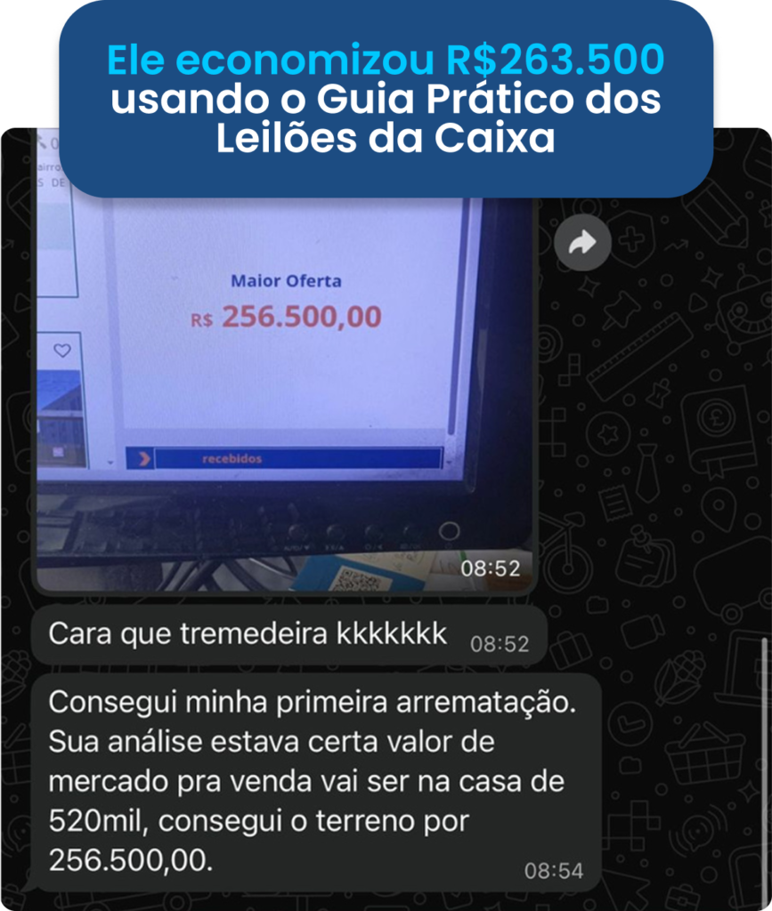 Foi por isso que eu criei o Guia Prático Leilões da Caixa com todo o passo a passo para você seguir e arrematar seu primeiro imóvel com 70% de desconto já na primeira semana.